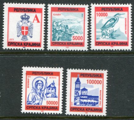 Croatia – Serbian Post (Krajina): 1993 15 June). Castles, Monastery. Heron design and internal letter rate stamp unmounted mint. Mi. 12/16, Sg. K8, K9/K12, . **