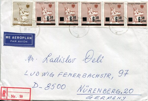 Albania: circa 1993 registered cover to Germany franked with 50q and strip of five 6l.50 surcharged on 20q Mother Albania definitive stamps tied by Durres datestamps. Sg. 2332, 2557