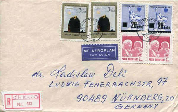 Albania: 1994 (22 April). Registered cover to Germany franked with pair of 20l surcharged on 90q and pair of 2l Mother Theresa definitive and two 3l Europa Cept commemorative stamps tied by Shkoder datestamps. Sc. 2428, 2438, 2441 – Sg. 2542, 2560, 2562