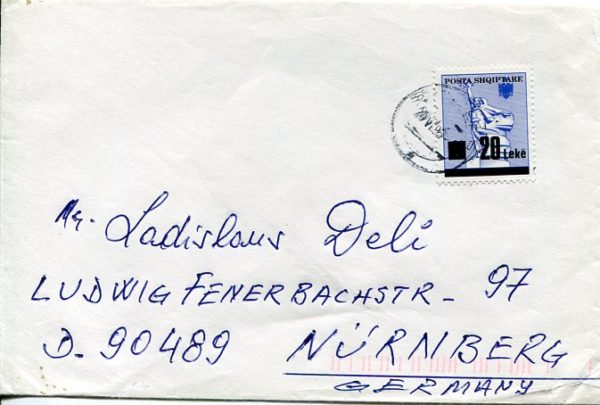 Albania: 1995 (20 June). Cover to Germany franked with 20l surcharged on 90q definitive stamp tied by Shkoder datestamp. Sc. 2438 – Sg. 2559