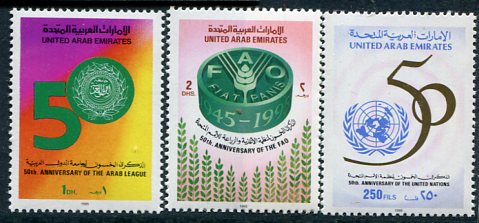 United Arab Emirates: 1995 (22 March). Anniversaries FAO, Arab League, UN unmounted mint set. Mi. 475/477, Sg. 483/485