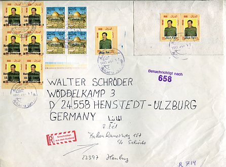 Iraq: 1996 registered large envelope to Germany franked with marginal block of four 25d surcharged on 5f Palestinian Welfare, single and a pair of 250d surcharged on 350f Saddam Hussain definitives and corner marginal block of six 25d surcharged on 350f Referendum Day overprinted stamps tied by AL-ILWIYA COM. CAMP (Al Malwiya) datestamps. Sg. 1955,1986, 1993