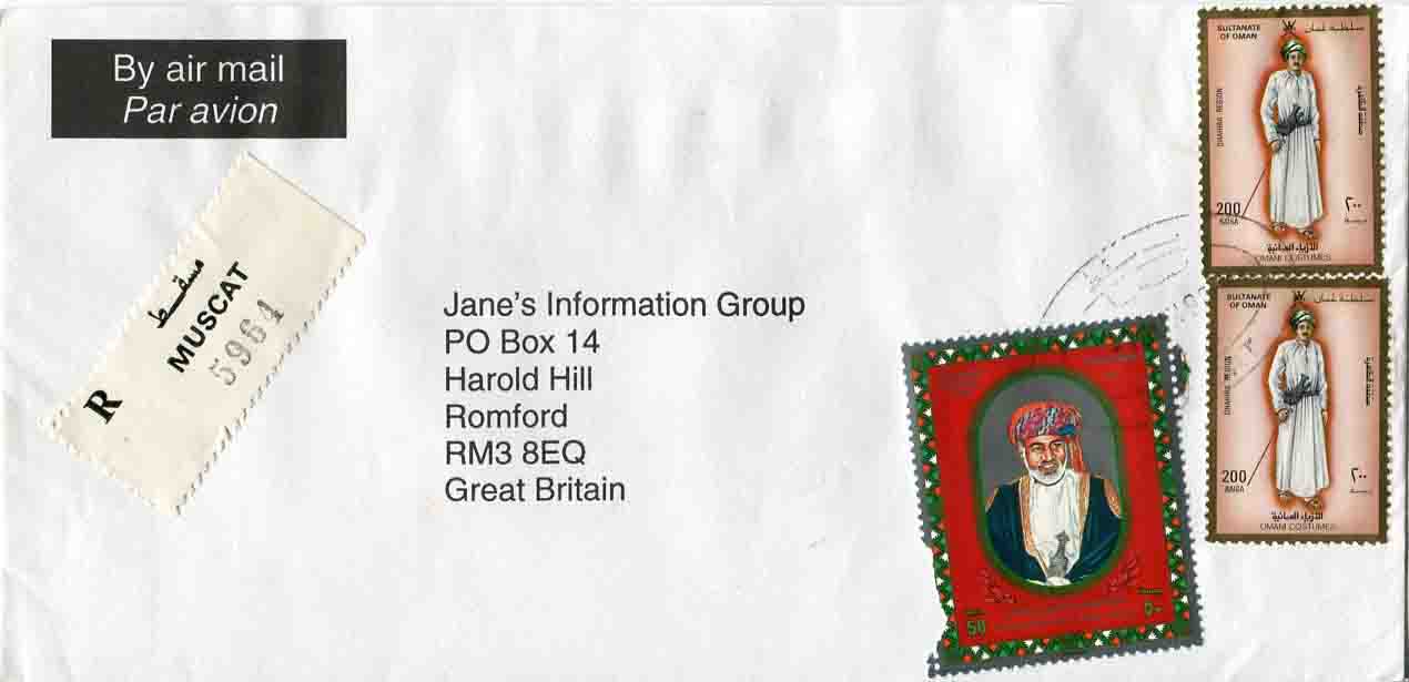 Oman: 1996 registered cover from MUSCAT to England franked with two 200b of 1989 Traditional Costumes definitive and 50B of 1995 Bedouin costume stamps. Mi.336,400