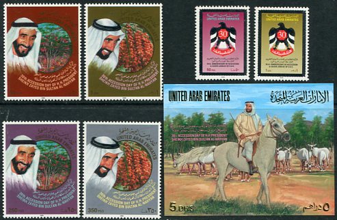 United Arab Emirates: 1996 (2 December). Abu Dhabi Sultan unmounted mint set and miniature sheet. Mi. 525/530 + Block 16 – Sg. 539/544, MS545