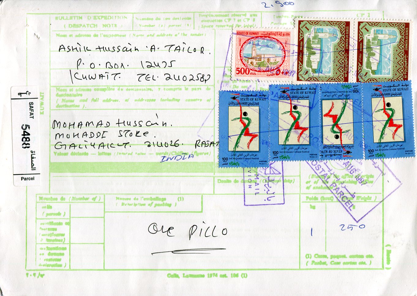 Kuwait: 1997 Postal Parcel dispatch notice from Safat to India franked with four 100f Al-Qurain Cultural Festival, 500f and two 1d definitive stamp tied by boxed date stamps. Mi. 909/910, 1474 – Sg. 910a, 911, 1483