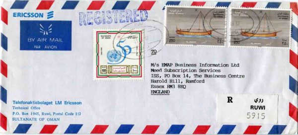 Oman: 1997 registered commercial cover from RUWI to England franked with two 250b Omani Vessels definitive and 100b UN Anniversary commemorative stamps. Mi.399,407