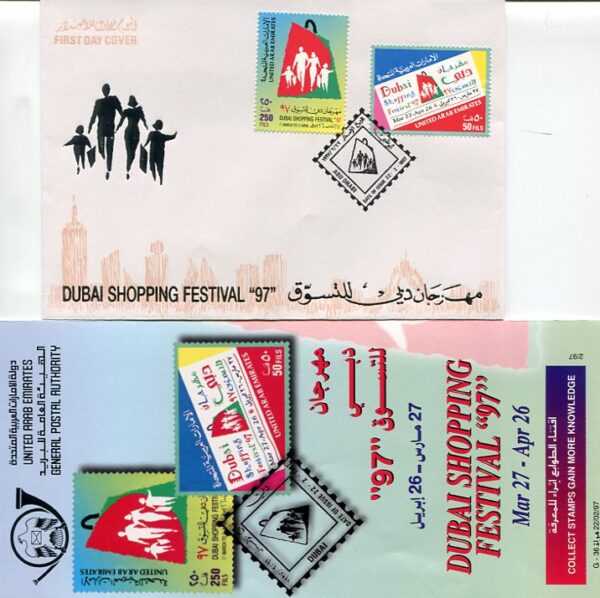 United Arab Emirates: 1997 (22 February). Dubai Shopping Festival ABU DHABI cancelled first day cover and information booklet. Mi. 539/540