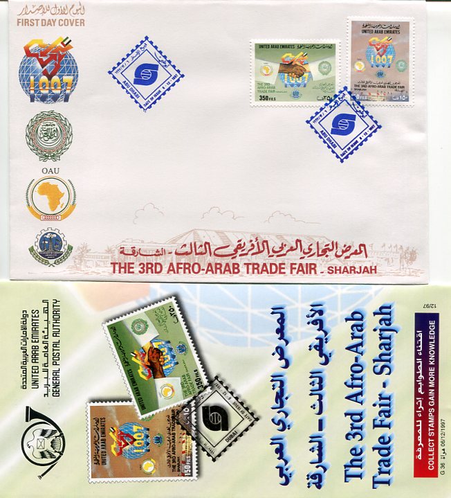 United Arab Emirates: 1997 (6 December). Afro-Arab Trade Fair ABU DHABI cancelled first day cover and information booklet. Mi. 569/570
