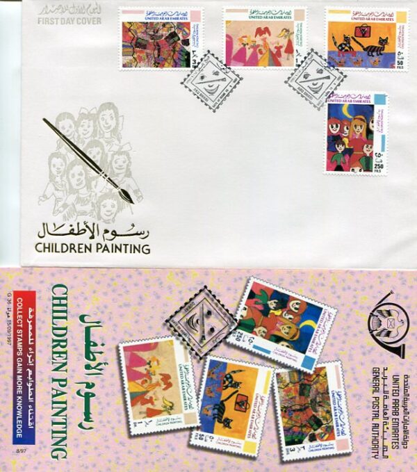 United Arab Emirates: 1997 (15 September). Children Drawings ABU DHABI cancelled first day cover and information booklet. Mi. 553/556