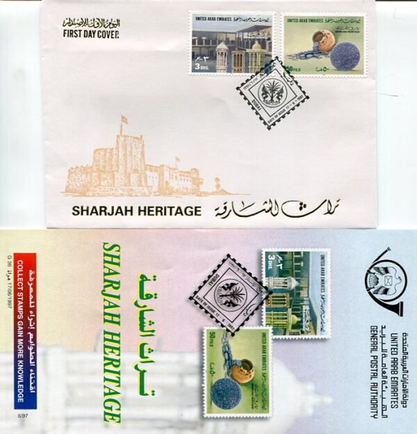 United Arab Emirates: 1997 (17 June). Sharjah Cultural Heritage DUBAI cancelled first day cover and information booklet. Mi. 549/550