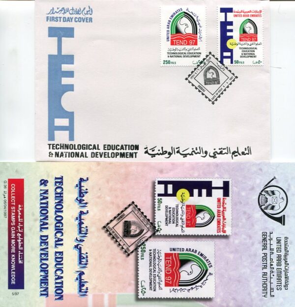 United Arab Emirates: 1997 (6 April). TEND Technological Education DUBAI cancelled first day cover and information booklet. Mi. 547/548