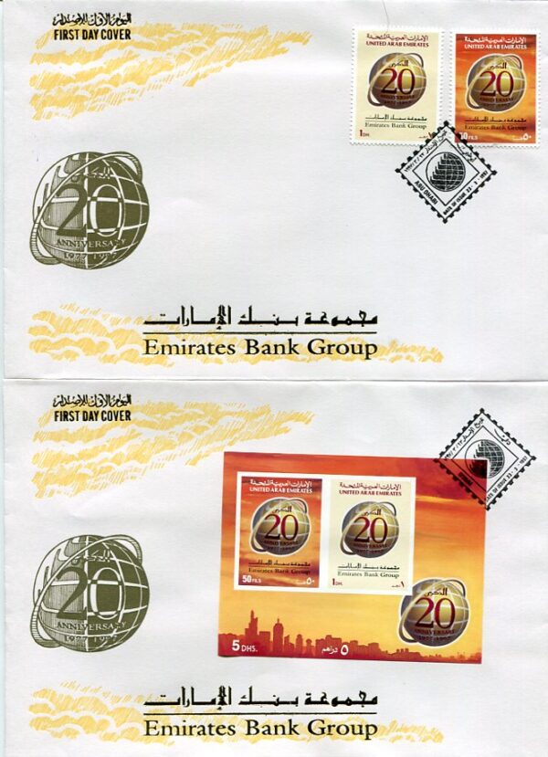 United Arab Emirates: 1997 (23 March). Emirates Bank ABU DHABI cancelled set and DUBAI cancelled souvenir sheet first day covers and information booklet. Mi. 545A/545B, Block 18