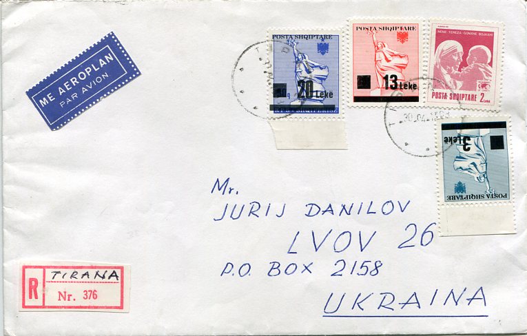 Albania: 1998 (30 April). Registered cover to Ukraine franked with 2l Mother Theresa, 3l on 10q, 13l on 30q and 20l on 90q surcharged definitive stamps tied by Tirane datestamps. Reverse Russia CCCP transit cds. Sc. 2428, 2435, 2437, 2438 – Sg. 2542, 2556, 2558, 2559