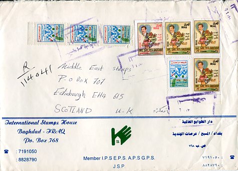 Iraq: 1998 registered large envelope to Scotland franked with six 100d definitive issue and block of six and three 25d and 100d Saddam Referendum stamps tied by Baghdad box datestamps. Sg. 2020, 2023, 2024