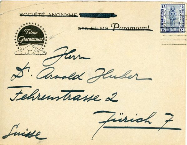 Egypt: 1921 Paramount Films advertising cover to Zurich, Switzerland.