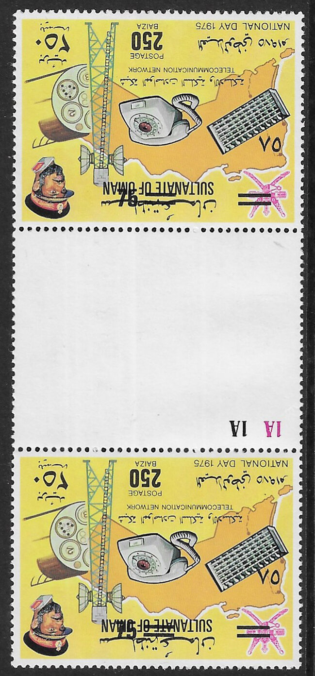 Oman: 1978 (30 July). 75b. surcharged on 250b. unmounted mint gutter pair with surcharge inverted error. Sg. 214 **