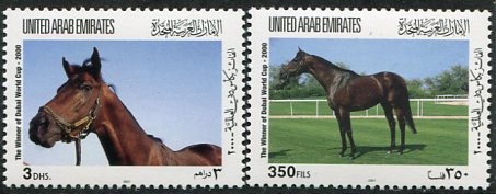 United Arab Emirates: 2001 (24 March). Dubai Millennium Horse Race Winner unmounted mint set. Mi. 651/652, Sg. 665/666