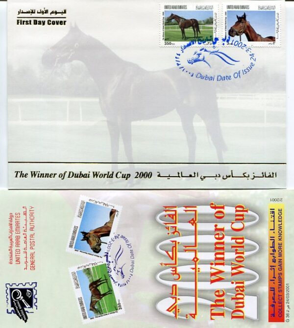 United Arab Emirates: 2001 (24 March). Dubai World Cup Horse Race DUBAI cancelled first day cover and information booklet. Mi. 651/652