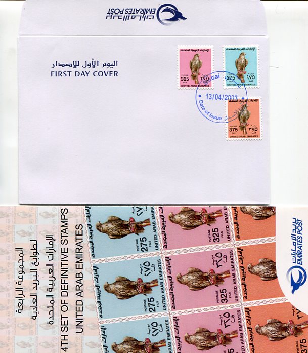 United Arab Emirates: 2003 (13 April). Falcon Definitives DUBAI cancelled first day cover and information booklet. Mi. 702/704