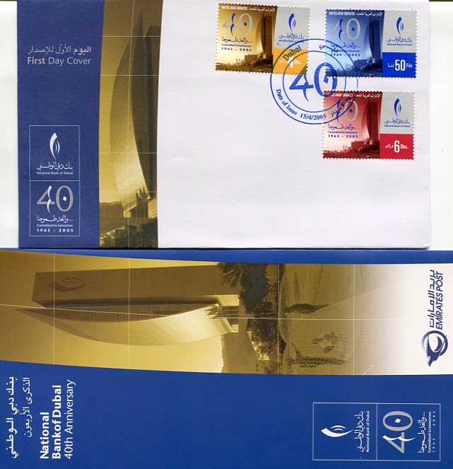 United Arab Emirates: 2003 (15 April). National Bank DUBAI cancelled first day cover and information booklet. Mi. 711/713