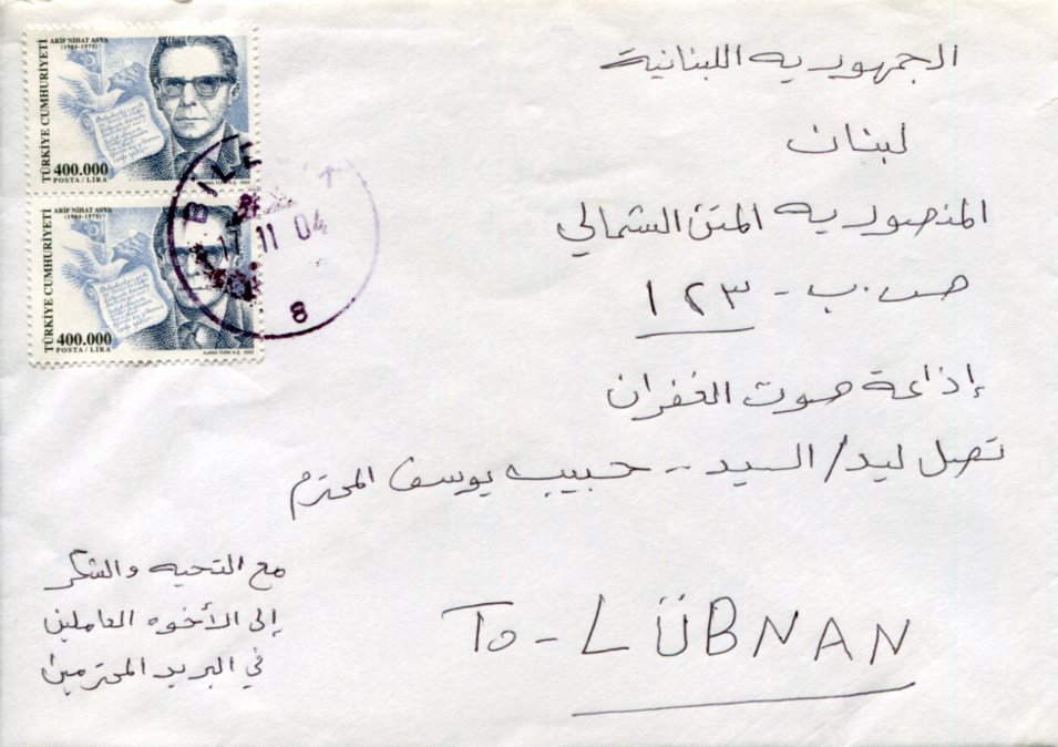 Turkey: 2004 cover from a prisoner in Bilecik to Lebanon franked with pair of 400,000l Turkish Poet commemorative stamps. Isfila 3702