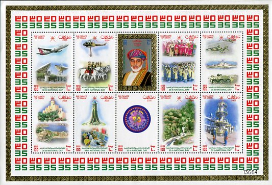 Oman: 2005 (18 November). National Day – Aircraft, Helicopter, Musicians, Dancers, Castle, Clock Tower etc. unmounted mint sheetlet. Mi. 615/624, Sg. 654a