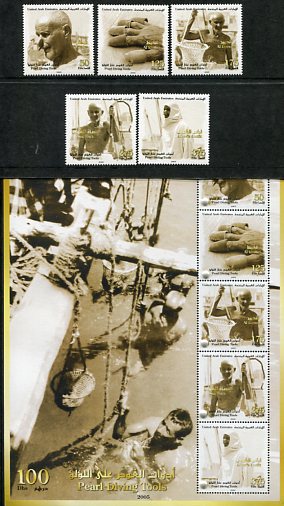 United Arab Emirates: 2005 (21 December). Pearl Diving Tools unmounted mint set and miniature sheet with pearls attached. Mi. 815/819 + Block 26