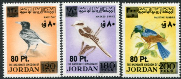 Jordan: 2009 (20 December). Birds stamps of 1970 surcharged 80pt. unmounted mint set. Sg. 2309/2311. **