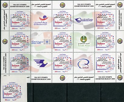 Oman: 2009 (15 November). GCC Gulf Co-operation Council Stamp Exhibition, Muscat self-adhesive single and unmounted mint sheet. Mi. 65I/654IX, 655 – Sg. 693 + MS694