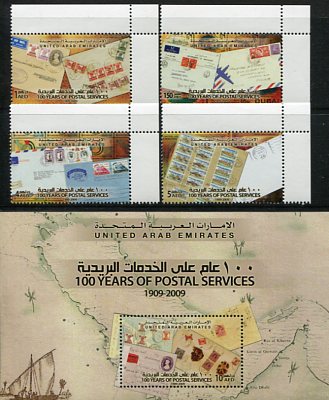 United Arab Emirates: 2009 (19 August). Centenary of Postal Service unmounted mint set and miniature sheet. Mi. 982/985 + Block 52, Sg. 1013/1016, MS1017