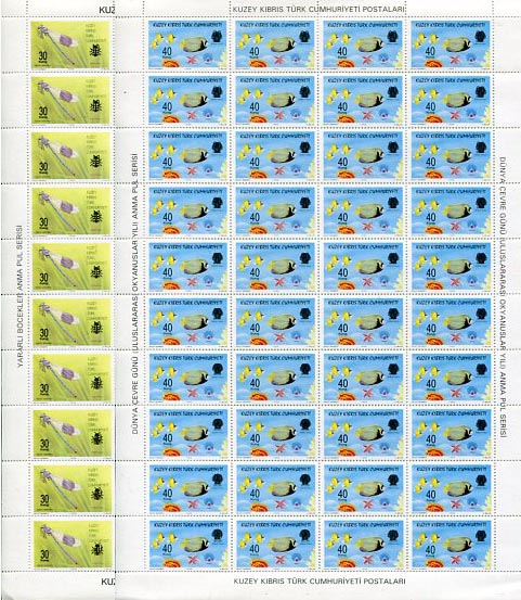 Turkish Cyprus: 2014 (4 July). Surcharged on fish and insects postage stamps unmounted mint complete sheet of 40 set. Isfila KT818/KT819. **