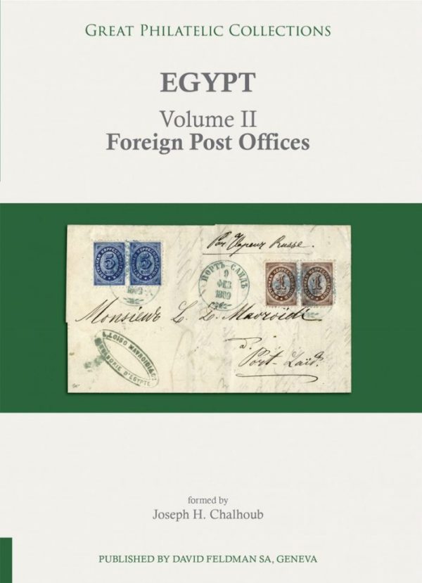 Egypt: Great Philatelic Collections series from David Feldman SA ‘Egypt volume 2 The Foreign Post Offices in Egypt’ ,Joseph H. Chalhoub collection’. Hardbound with dust-jacket, published 2017, 290 pages, full colour, limited edition of 75 copies. Free UK post, Worldwide is £20,