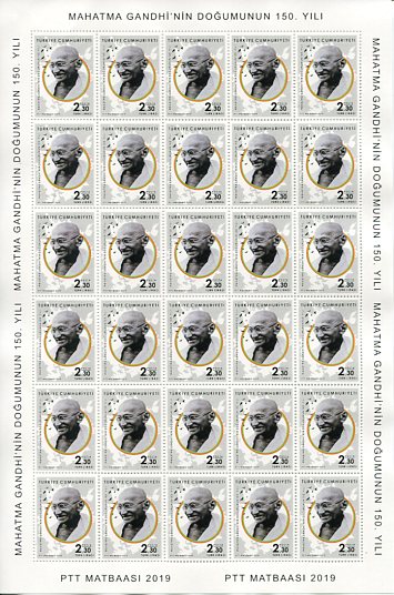 Turkey: 2019 150th Birth Anniversary of Mahatma Gandhi unmounted mint sheet of 30.