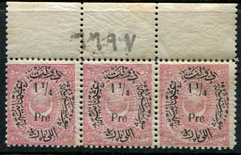 Ottoman Empire: 1876 (13 January). Dulos type surcharged issue 1 1/4 on 50p unmounted mint imprint top marginal strip of three.