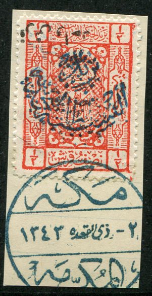 Saudi Arabia – Nejdi Occupation of Hejaz: 1925 (August). Nejd Sultanate Post handstamped in blue on 1/2pi scarlet further surcharged one piastre (Qirsh Wahid) on piece with cto datestamp, entire surcharge inverted on top error. Sg. 239a