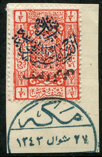 Saudi Arabia – Nejdi Occupation of Hejaz: 1925 (August). Nejd Sultanate Post handstamped in blue on 1/2pi scarlet further surcharged one and a half piastre on piece with CTO datestamp, Qirsh on surcharge inverted error. Sg. 241b