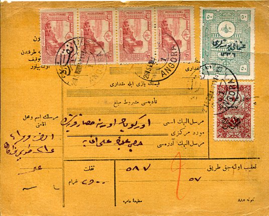 Turkey – Anatolian Government: 1921 (29 May). Money order to Ürgüp franked with type I ‘Osmanli Postalari 1336’ handstamped 50pi grey-green Ottoman Religious Tribunals revenue, type VII ‘Osmanli Postalari 1337’ overprinted on 20pa surcharged 1pi Hejaz Railway Aid and strip of four 20pa Ottoman pictorial stamps tied by Ankara – Angora 1 (A&P type 6) bilingual datestamps. Reverse 2 June Keskin (A&P type 1 – R), 4 June Kırşehri – Kirchehri 1 (A&P type 6 – RR) transit and 7 June Ürgüb 1 (A&P type 5 – R) arrival cds’s. Stamp slitted as required. Sg. A19, A58 – Isfila 466, 968, 1036