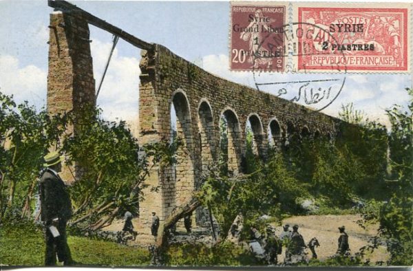 Syria: 1924 (24 January). Picture postcard titled ‘Antioche – Les Arcs de Binari’ to France franked with Syrie Grand Liban overprinted 1pi on 20c and SYRIE overprinted 2pi on 40c French stamps tied by ANTIOCHE (Antakya, Turkey) datestamp. Sg. 101, 127