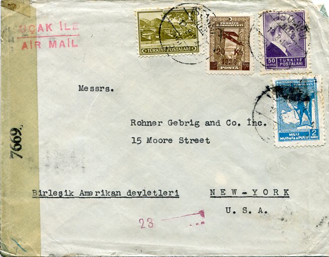 Turkey: 1944 (12 August). Commercial airmail cover to United States franked with 20k overprinted airmail issue of 1934, 1k pictorial, 50k Inonu definitive and 2k National Defence obligatory tax stamps tied by Istanbul datestamps and OPENED BY EXAMiNER 7669 censor label.
