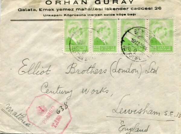 Turkey: 1944 (10 December). Commercial printed matter rate cover to England franked with strip of four President Inönü portrait definitive stamps tied by Beyoglu datestamps and red PASSED T.133 British censor cachet. Cover flap missing.