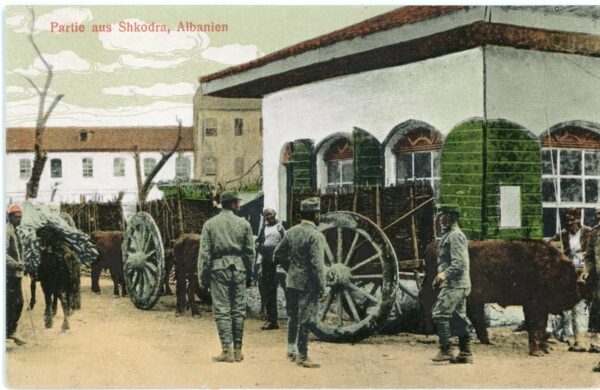 Albania Shkoder Oxcarts and Soldiers ed Shoqujia Tregtare