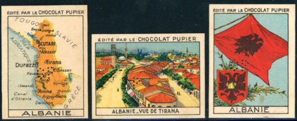 Albania: Chocolat Pupier firm perfin chocolate cards of Albania Map, Flag and Tirane