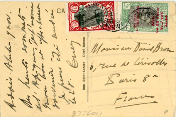 Ethiopia: 1930 postcard titled ‘HARAR – Le Masqual – Pretres Abyssins portant le livre des Evangiles’ to France franked with 1/2m. and 1m. Emperor Haile Selassie overprinted stamps tied by Addis Ababa datestamp. Sg. 250, 251