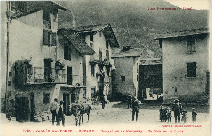 Andorra: Unused postcard titled ‘Encamp – Hameau de la Mosquera – Un Coin de la Place’. ed. Labouche Freres