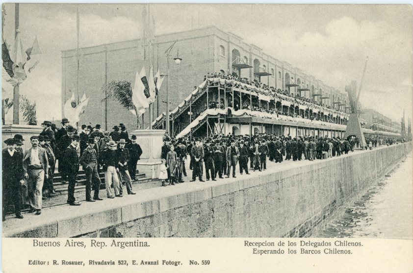 Argentina: Unused postcard titled ‘Recepcion de los Delegados Chilenos. Esperando los Barcos Chilenos’. ed. R. Rosauer