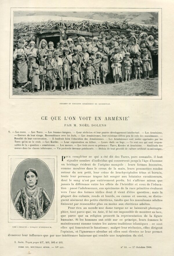 Armenia: 27 October 1906 dated Le Tour Du Monde #43, section titled ‘Ce que l’on voit en Arménie’ by Noel Dolens. 12 printed pages with 15 images (one full page). 231 x 301 mm. Costumes, Kurdistan, Erzurum, Erzincan, Siirt, Muş etc.