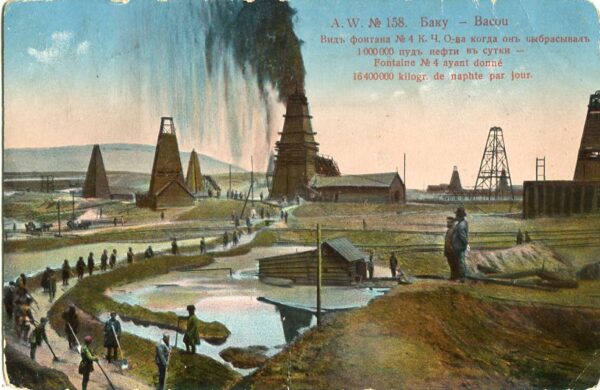 Azerbaijan: Unused Baku postcard titled ‘Bacou. Fontaine No.4 ayant donne 16 400 000 kilogr. de naphte par jour’,. Stamp removed,