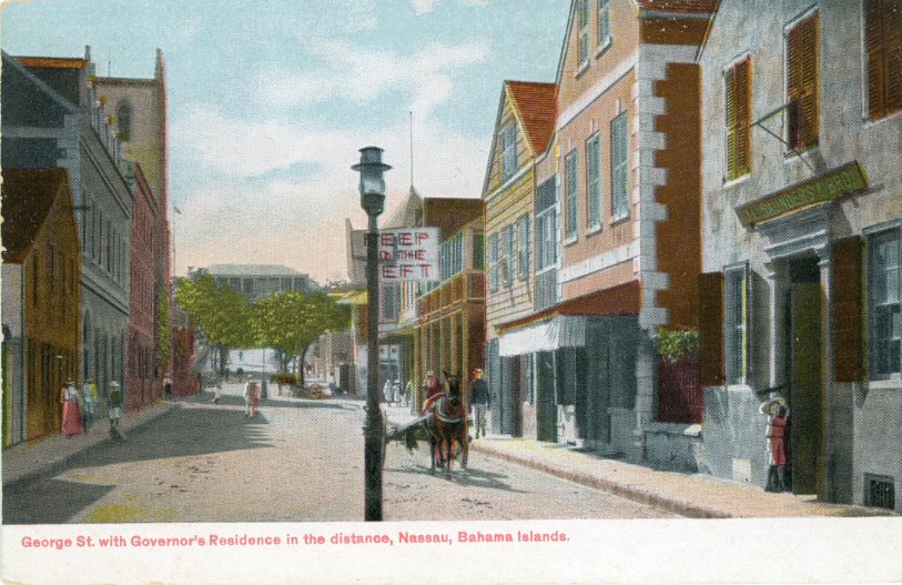 Bahamas: Unused postcard titled ‘George St. with Governor’s Residence in the distance’. ed. Walter Moore