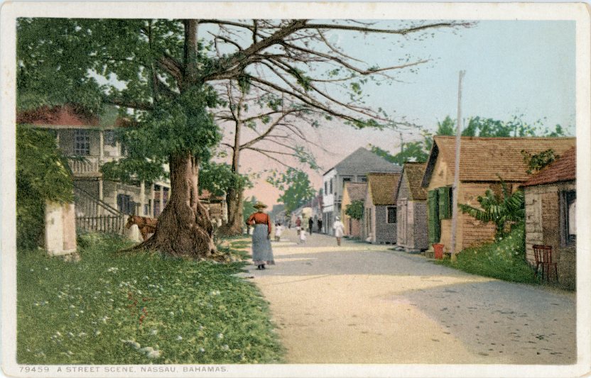 Bahamas: Unused postcard titled ‘A Street Scene, Nassau’. ed. Phostint