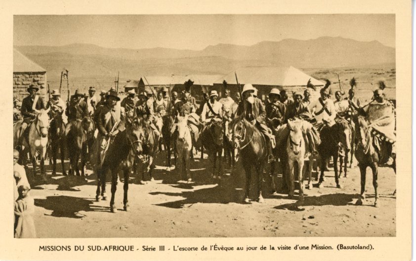 Lesotho – Basutoland: Unused postcard titled ‘L’escorte de l’Eveque au jour de la visite d’une Mission’.